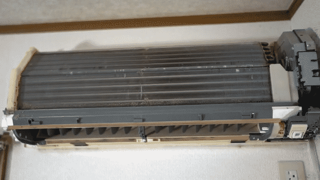 エアコンは、構造上、運転中に水を生みます。その受け皿がドレンパンと言います。ドレインは排水、パンは受け皿という意味です。そのドレンパンに水が溜まりますので、管を壁に穴をあけて外部へ通し、水を排出しているのです。よって、水があるところにカビが生えます。エアコンの黴臭さの要因のほとんどが、実はこのドレンパンにあったのです。もちろんドレンパン付近のシロッコファンにも水が付着しますので、シロッコファンにも黴が生えます。エアコンはこのようにカビが生えやすい機械なのです。しかも埃も吸い込み溜めてしまうので、埃臭さも発生するのです。埃の溜まりどころは主に、エアコン外部、フィルター、シロッコファンなどです。